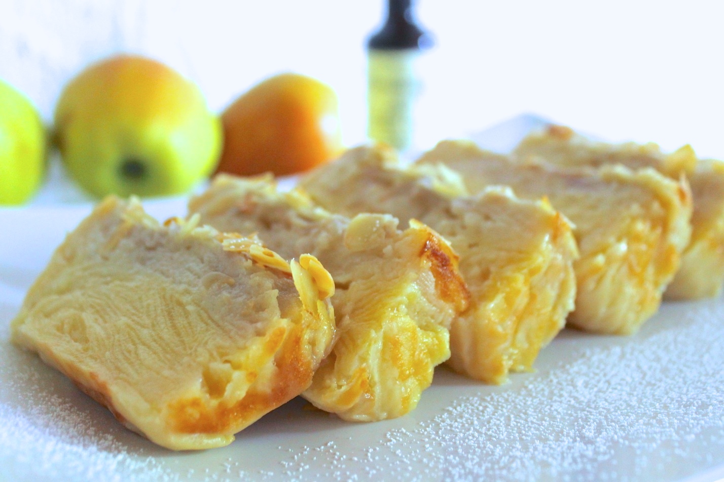 Obuolius nulupame, išdarinėjame ir supjaustome kuo plonesnėmis skiltelėmis (geriausia ir patogiausia būtų naudoti daržovių skustuką), suberiame ir įmaišome jas į vieną dalį tešlos. Tą patį padarome su kriaušėmis.