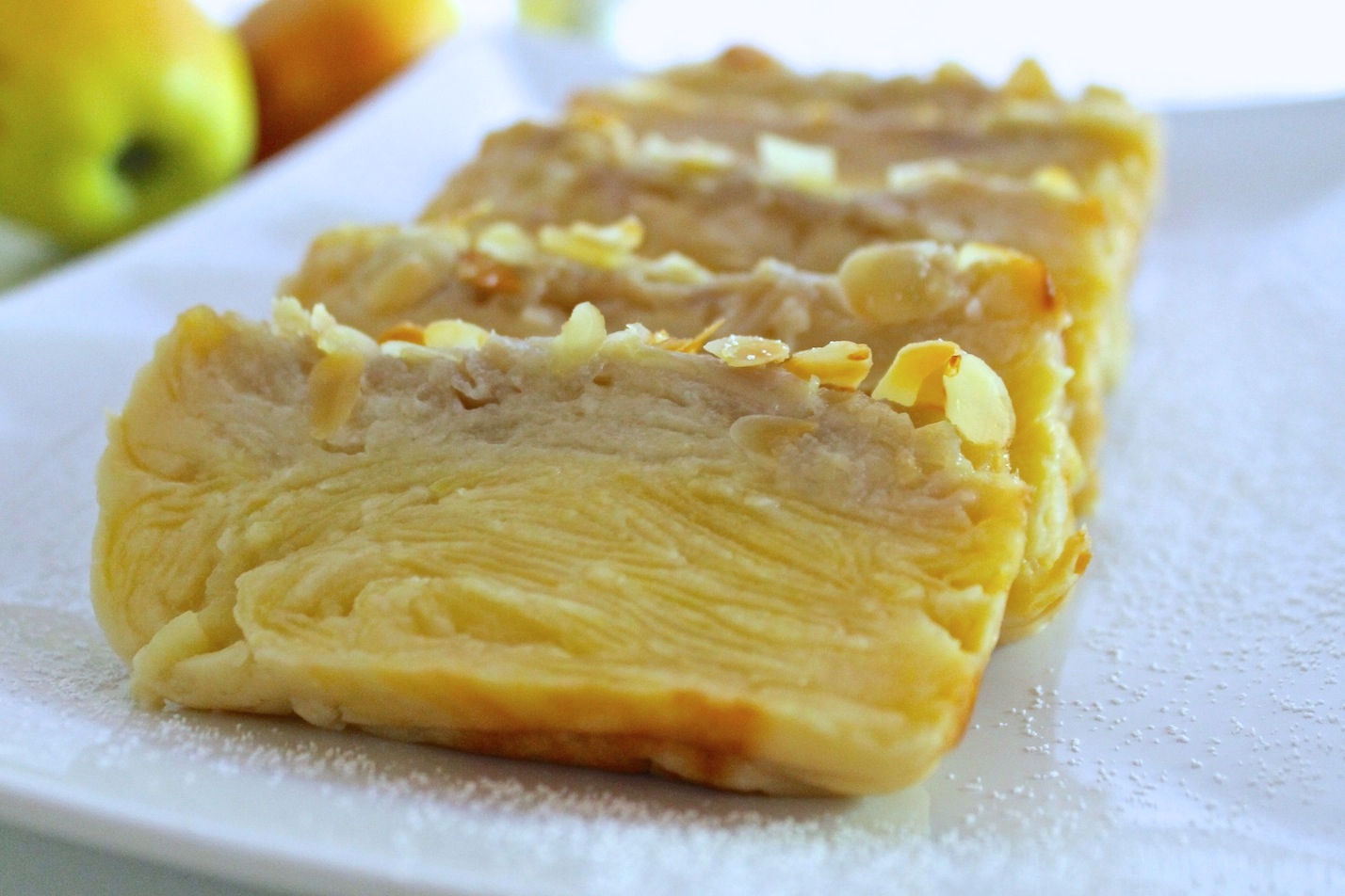 Į skardą, išklotą kepimo popieriumi, supilame obuolių tešlą, o ant viršaus paskleidžiame kriaušių tešlą. Pašauname į orkaitę ir kepame 40–45 minutes iki 180 °C temperatūros įkaitintoje orkaitėje. Leidžiame pyragui atvėsti ir sutvirtėti. Skanaus!