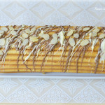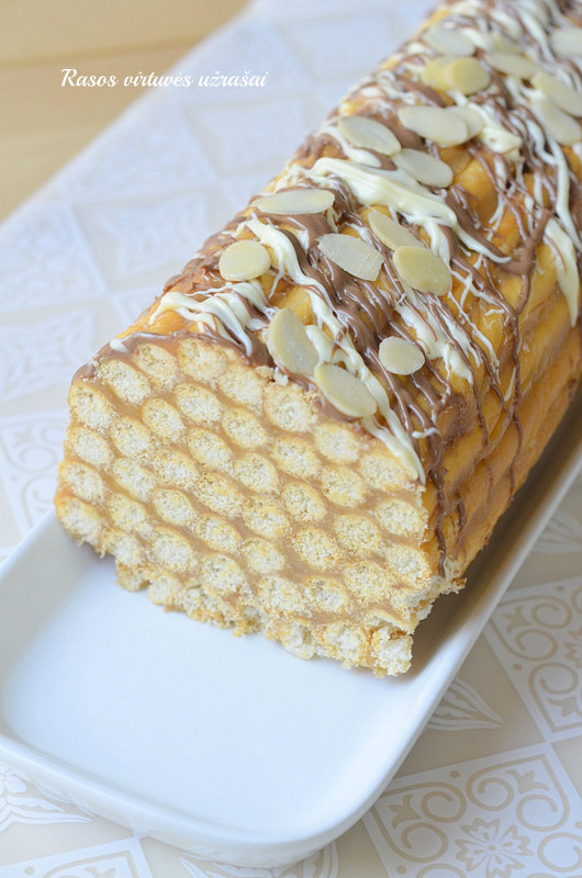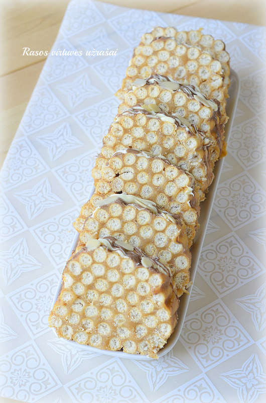 Ant maistinės plėvelės arba kepimo popieriaus sudėkite lazdeles, ant jų pilkite dar karštą saldainių masę ir susukite į ritinį. Palikite šaldytuve, kol sustings. Pjaustykite griežinėliais. Skanaus!