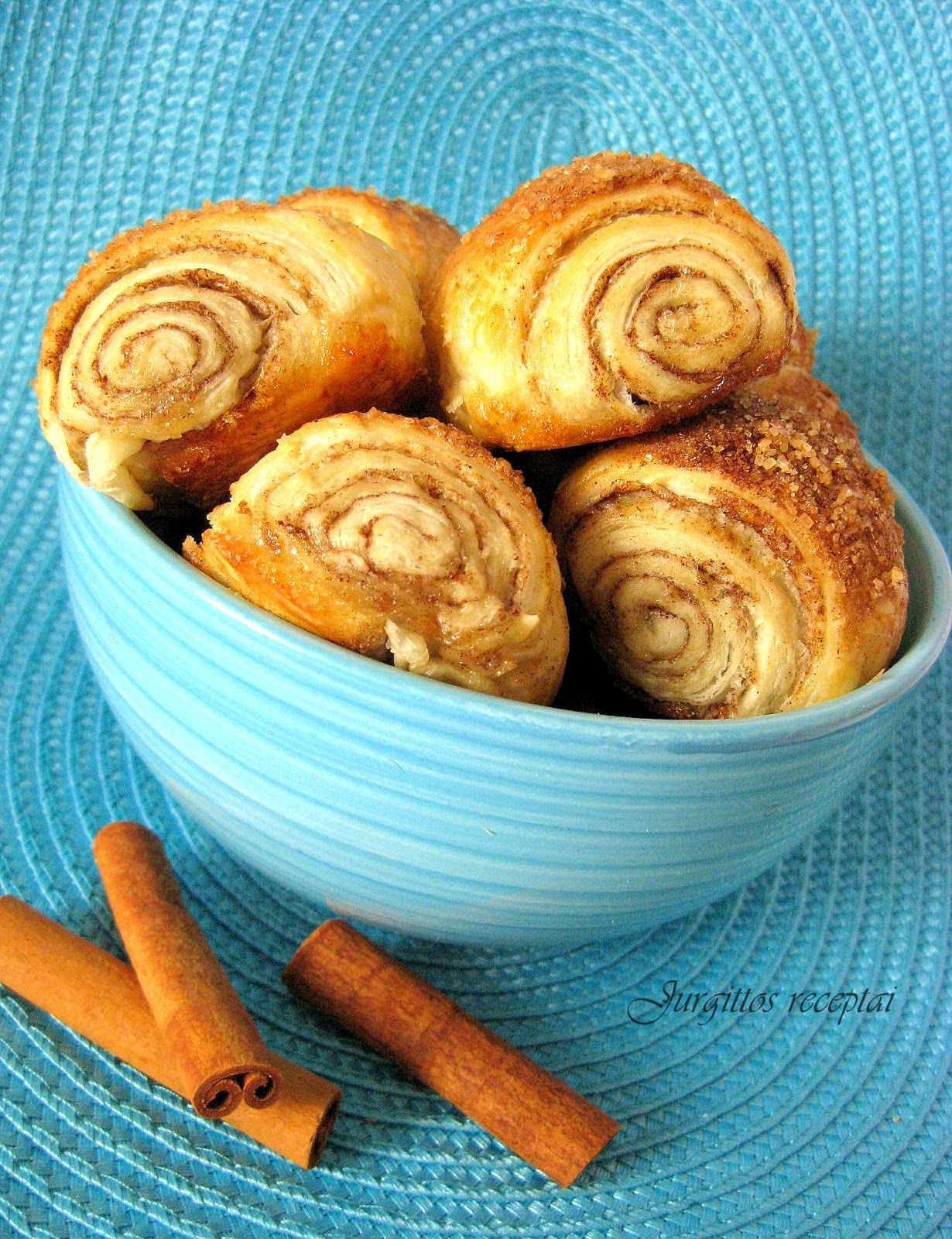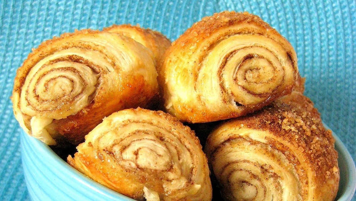 Tešlą atšildome, šiek tiek pakočiojame, kad lakštai būtų plonesni. Ištepame juos lengvai išplaktu baltymu (pasiliekame jo bandelėms aptepti). Pabarstome cukrumi, sumaišytu su cinamonu (irgi pasiliekame viršui).