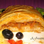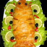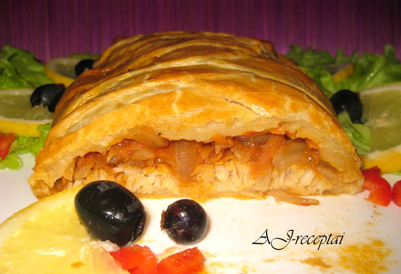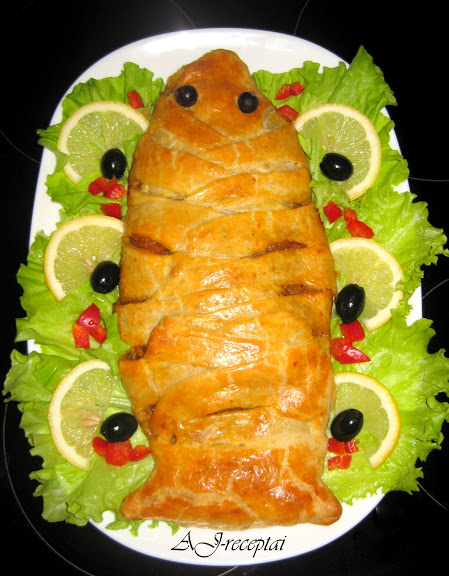 Ant tešlos lakšto dedame žuvį, o ant žuvies – daržoves. Lakšto šonus pjaustome, kaip parodyta nuotraukoje, ir juostelėmis uždengiame žuvį (kraštelius patepame plaktu kiaušiniu, kad suliptų). Gale lieka plati juosta – iš jos suformuojame uodegą. Aptepame pyragą kiaušiniu. Kepame iki 200 °C temperatūros įkaitintoje orkaitėje apie 30 min. Skanaus!