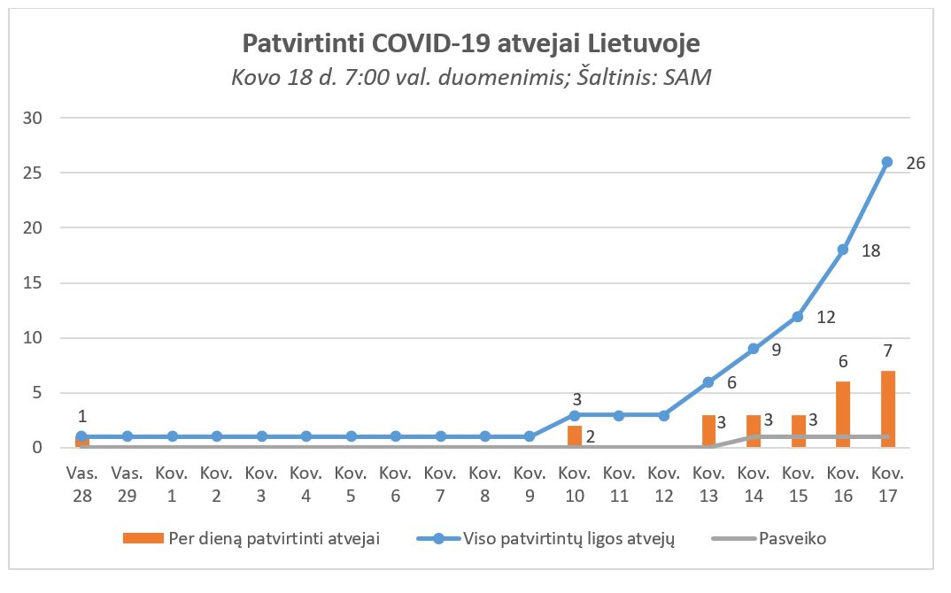 Lietuvoje patvirtintų atvejų dar mažai, bet jų padvigubėjo per pastarąsias 2 dienas. Kovo 15 d. jų buvo 12, o kovo 17 d. jų jau 26. Tai didelio augimo greitis. Esame eksponentinio augimo pradžioje.
