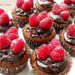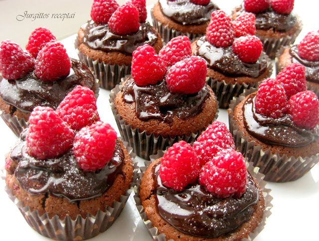 Papuošimas. Išlydome šokoladą su grietinėle ir atvėsiname. Užtepame ant keksiukų, uždedame po kelias avietes ir statome į šaldytuvą, kad šokoladas sustingtų. Prieš valgydami galime pabarstyti milteliniu cukrumi.