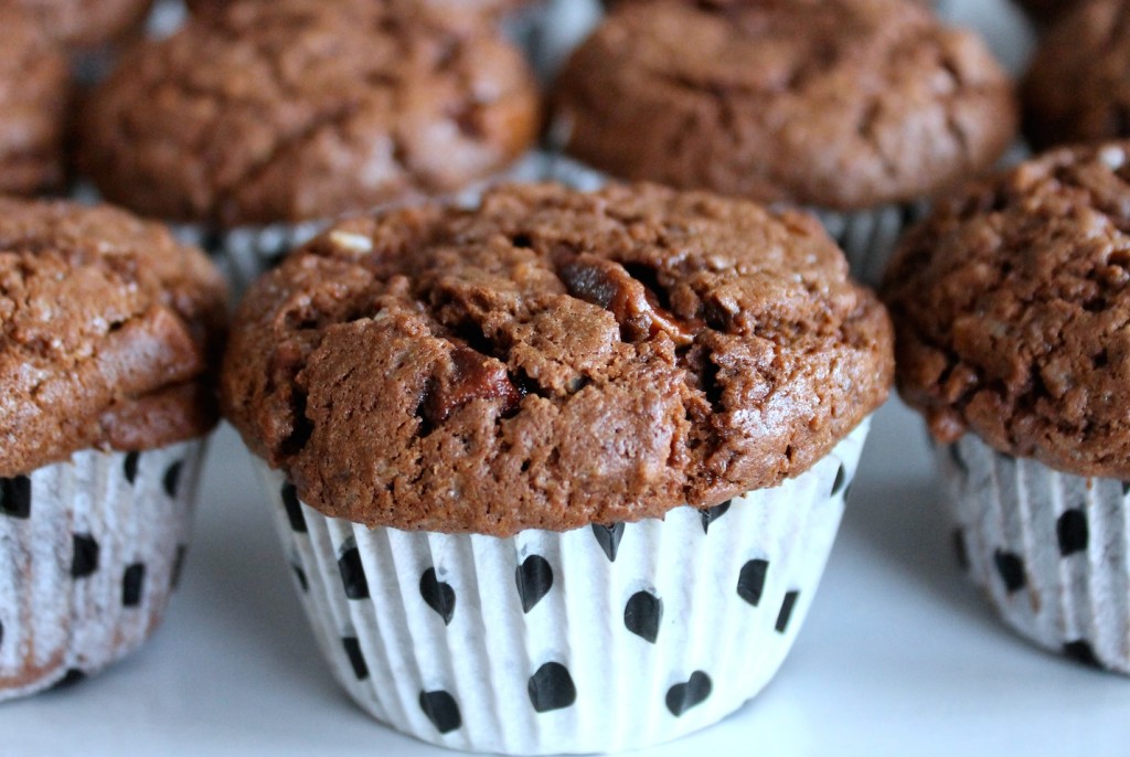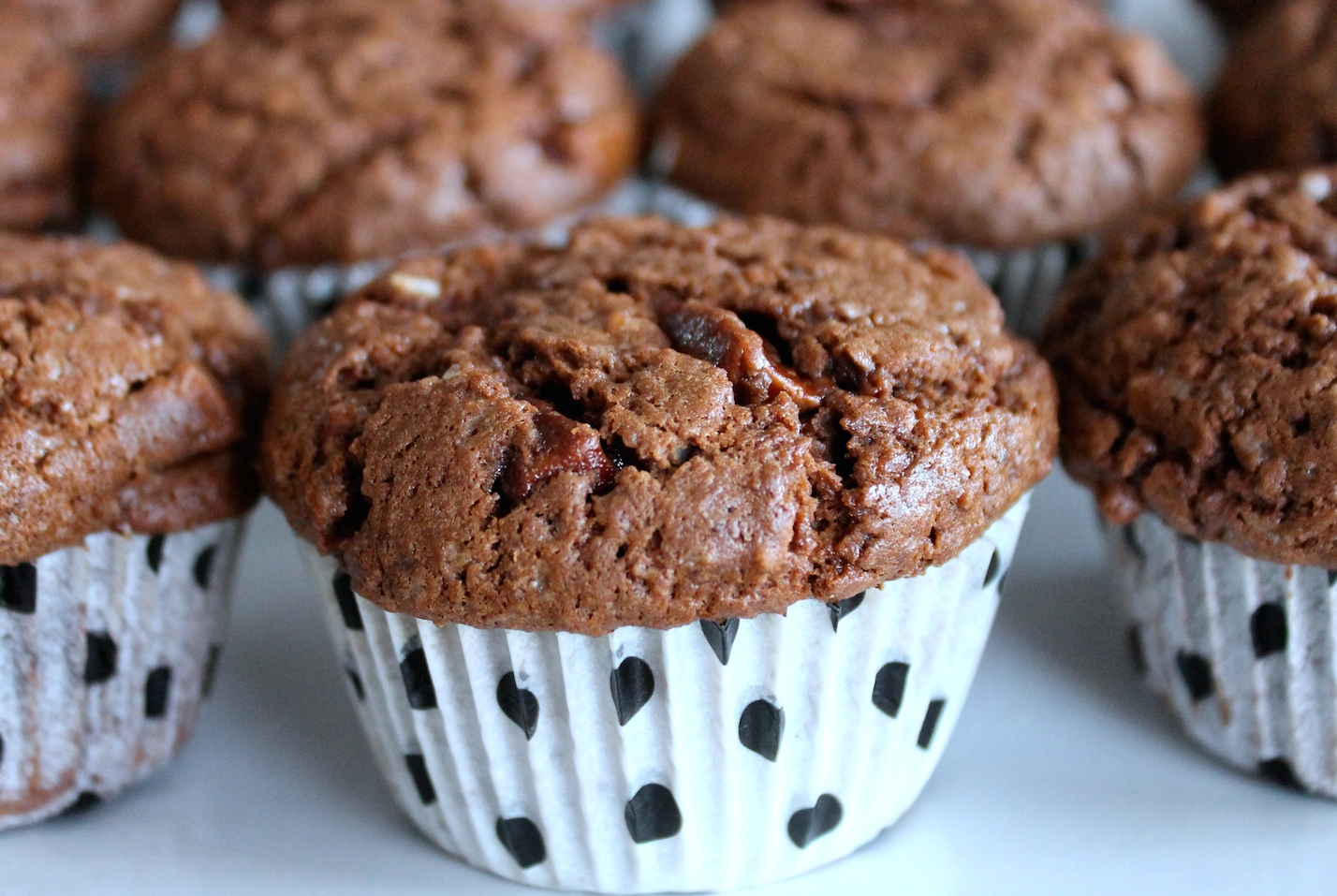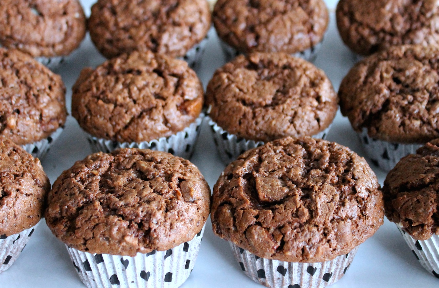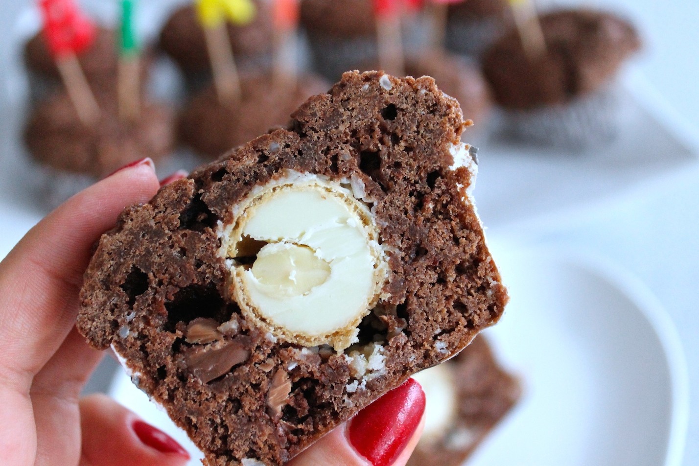 Gana drėgni šokoladiniai keksiukai su tirpstančiais burnoje pieniško šokolado gabalėliais ir staigmena viduje – „Raffaello“ saldainiais.