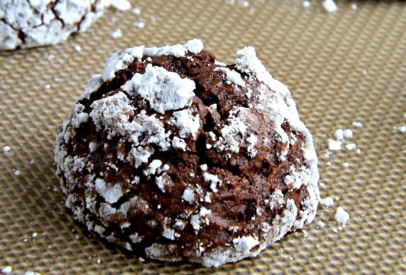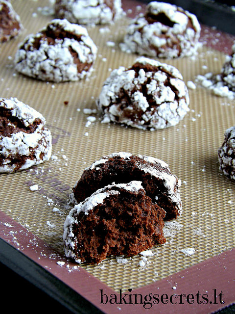 Gražiai įtrūkę, „apsnigti“ sodraus šokoladinio skonio sausainiai.