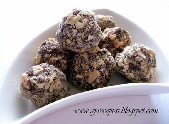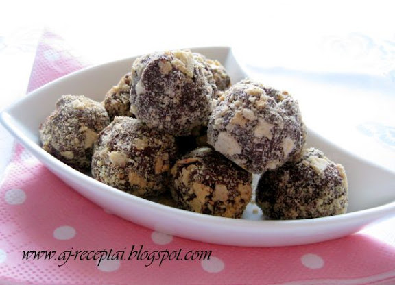 Imame du šaukštelius. Vienu paimamame šokolado, dedame jį į smulkintus vaflius ir abiem šaukšteliais voliodami vafliuose suteikiame triufelio formą. Laikome šaldytuve. Skanaus!