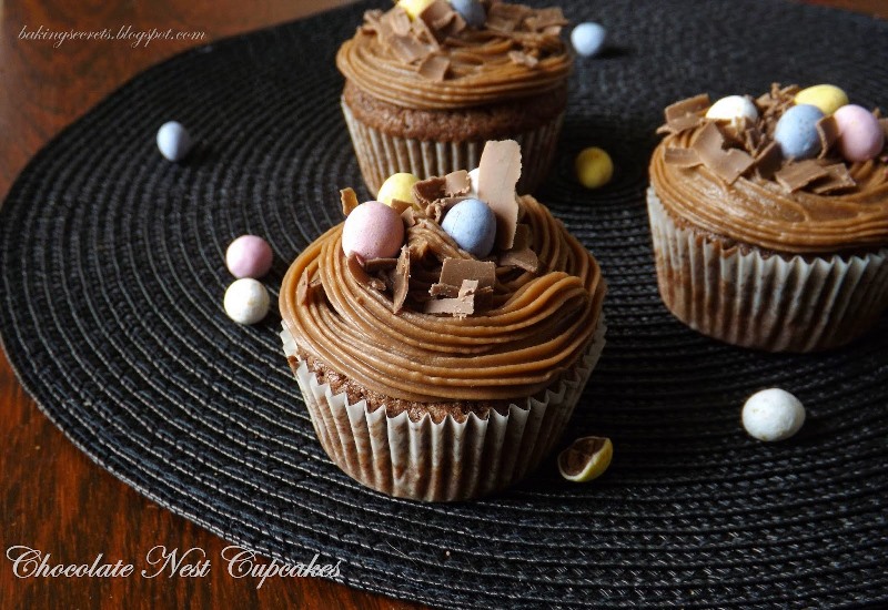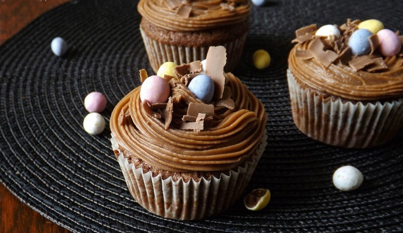 Berkite miltelinį cukrų į šokoladinį kremą ir maišykite, kol masė taps vienalytė. Atvėsinkite ir vėl išplakite. Keksiukus aptepkite kremu, dekoruokite mini kiaušiniais ir pieniško šokolado drožlėmis.