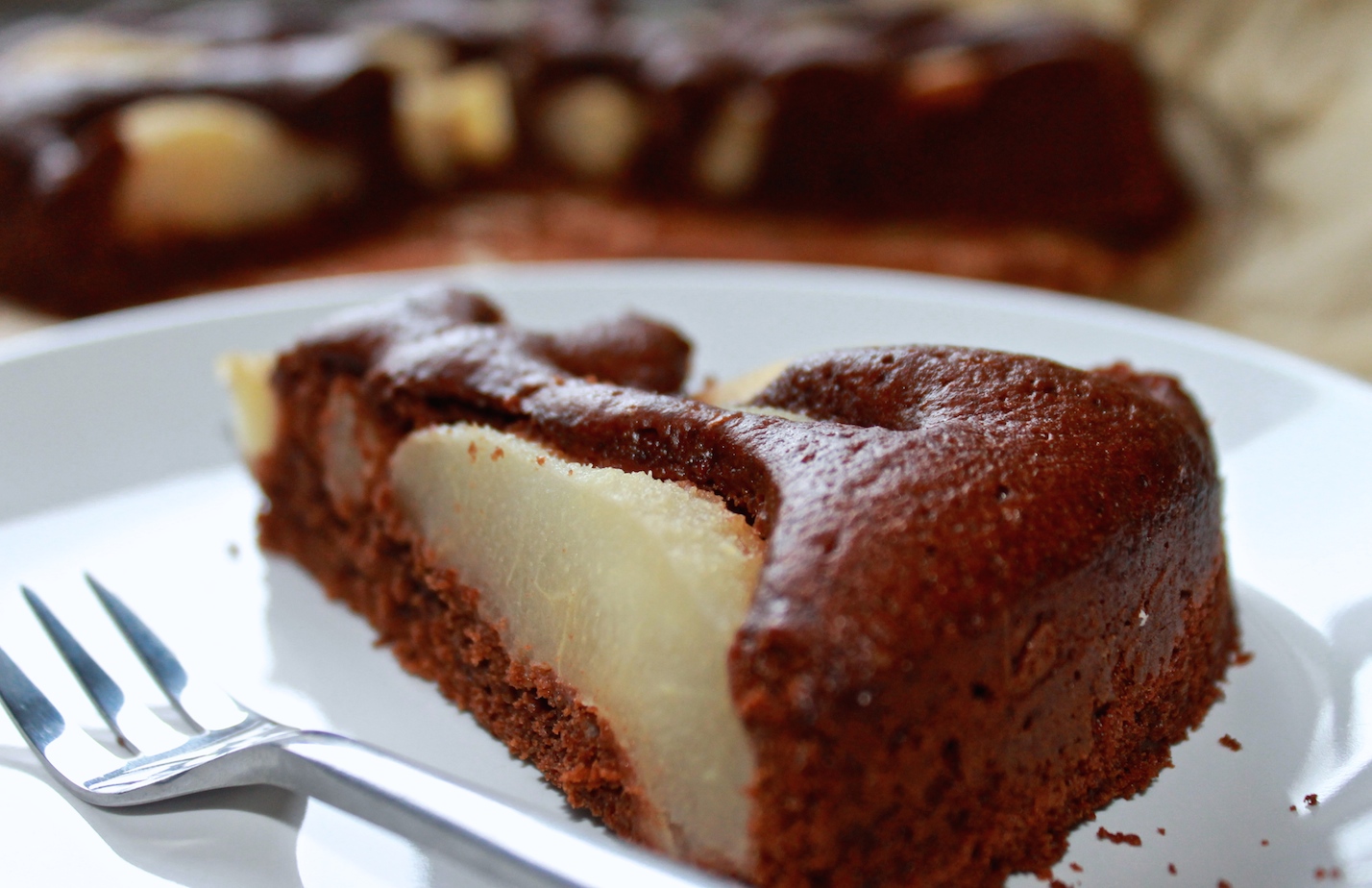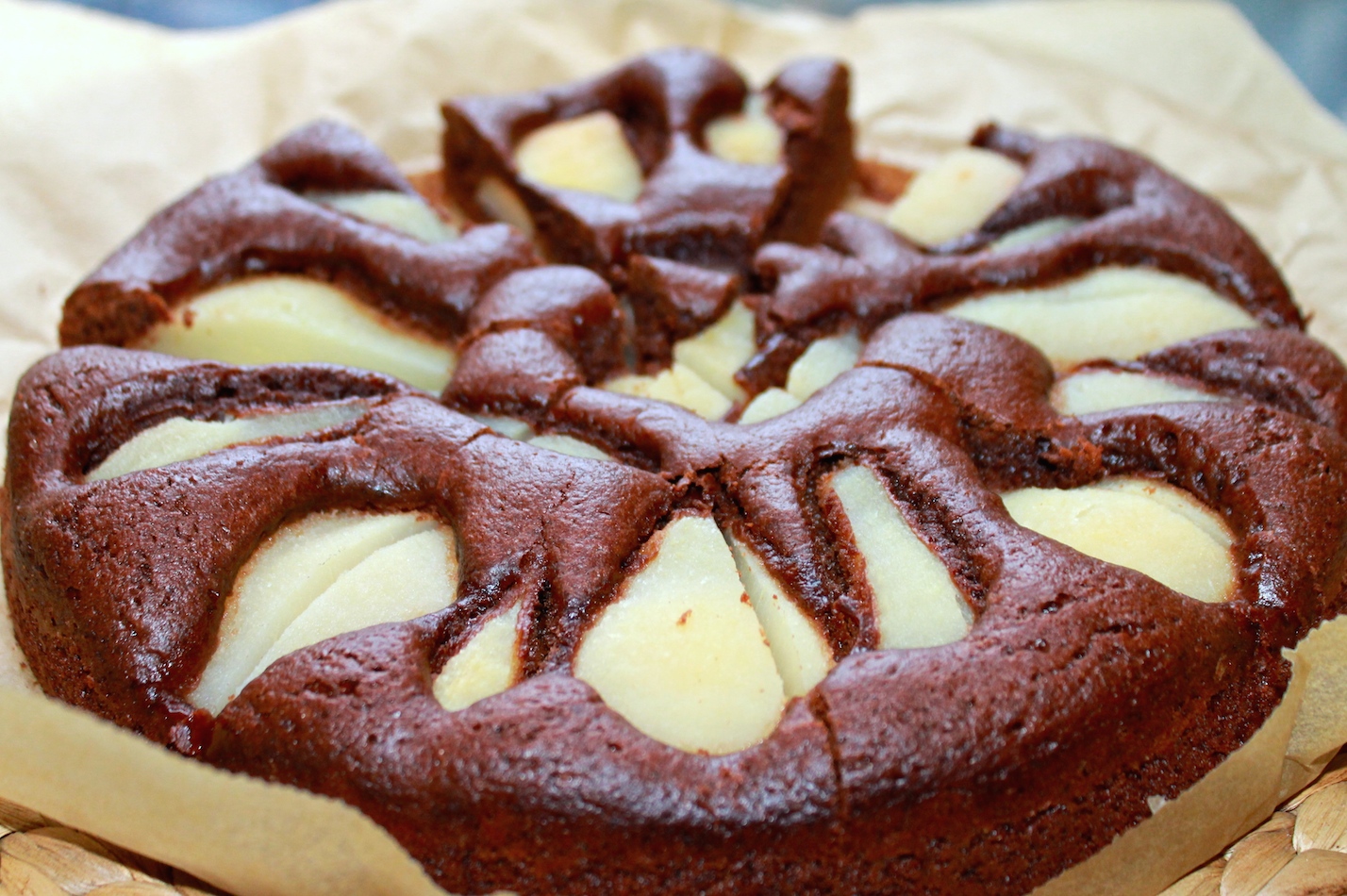 Kriaušes supjaustome stambiomis skiltelėmis. Sviestą išlydome su šokoladu. Paeiliui įmaišome miltelinį cukrų, vanilinį cukrų, kakavą, miltus ir kepimo miltelius. Įmušame kiaušinius ir plakame, kol susidaro vientisa blizgi masė. Tešlą supilame į paruoštą kepimo formą. Ant viršaus išdėliojame kriaušes. Kepame iki 180 °C įkaitintoje orkaitėje 30–40 minučių.