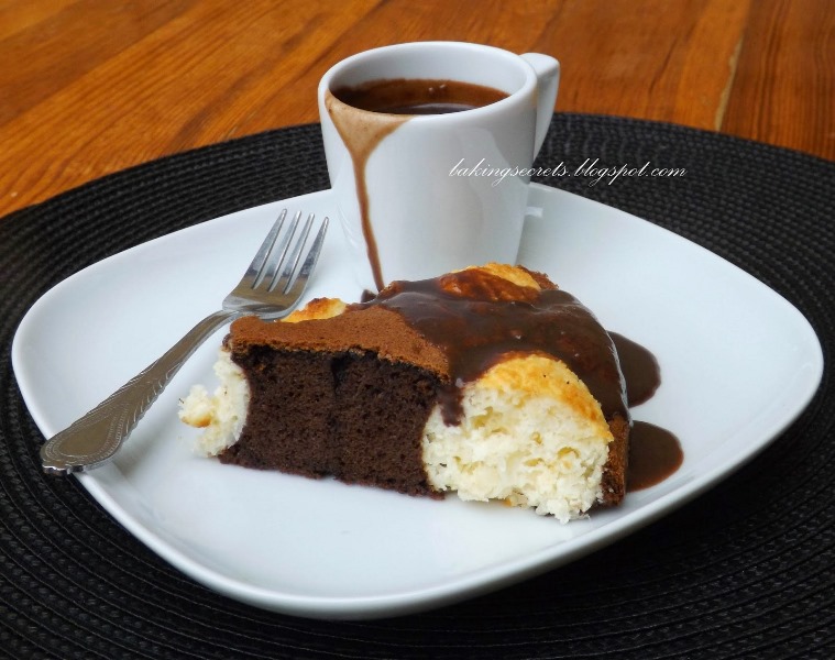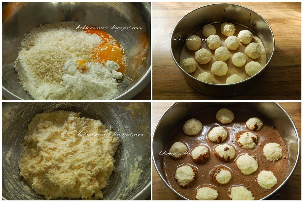 - Šokoladinę tešlą atsargiai supilkite į formą ant varškės kamuoliukų.