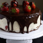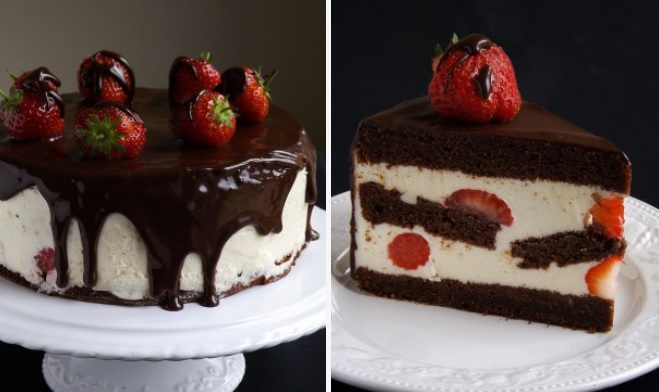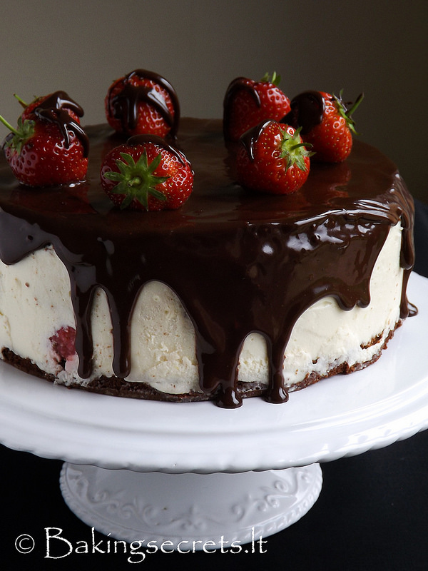 - Tortą puoškite šokoladiniu glajumi ir braškėmis.