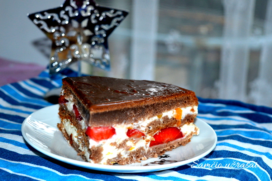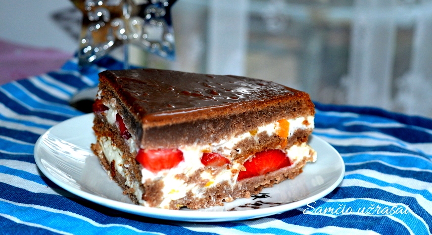 Dėkite vieną biskvitą į torto formą, ant jo išdėliokite braškes, paskleiskite pusę kremo, dėkite kitą biskvitą, dar braškių ir likusio kremo. Uždenkite likusiu biskvitu.