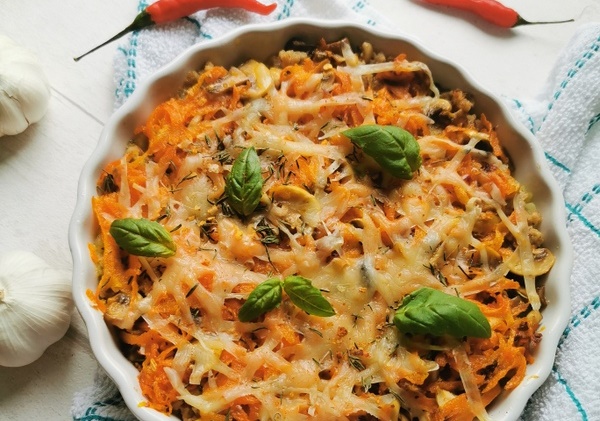 Bulves sutarkuokite, įmuškite kiaušinį, įberkite druskos, pipirų ir išmaišykite. Į kepimo formą, pateptą aliejumi, dėkite bulvių sluoksnį.