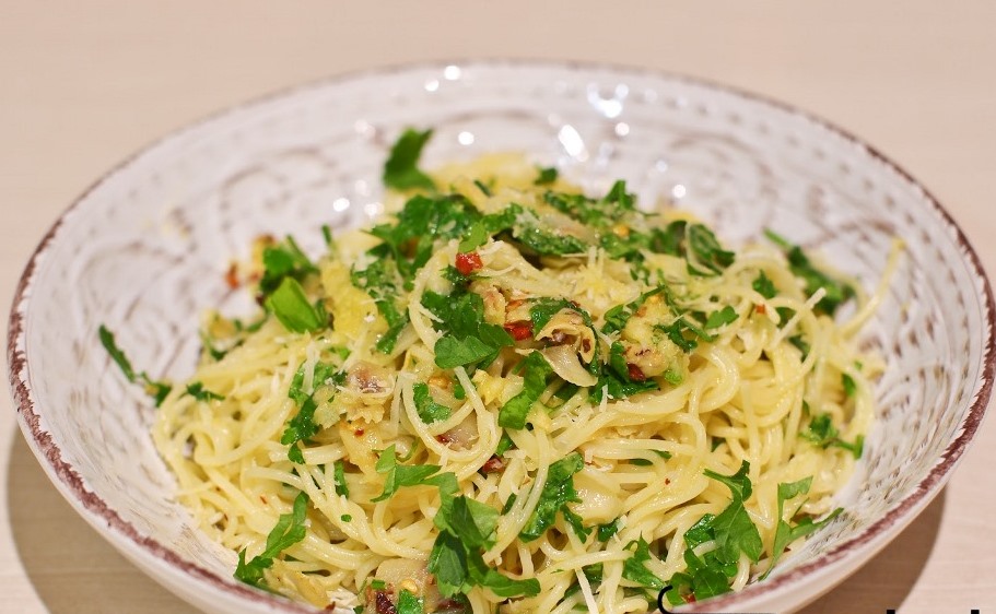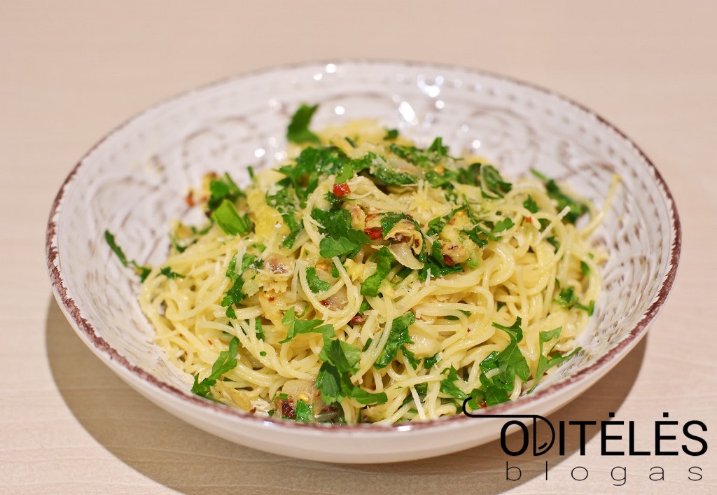 Keptuvės turinį supilkite ant makaronų, sudėkite pjaustytas petražoles, suberkite parmezano sūrį, įpilkite šlakelį makaronų nuoviro, pagardinkite druska ir viską gerai išmaišykite.
