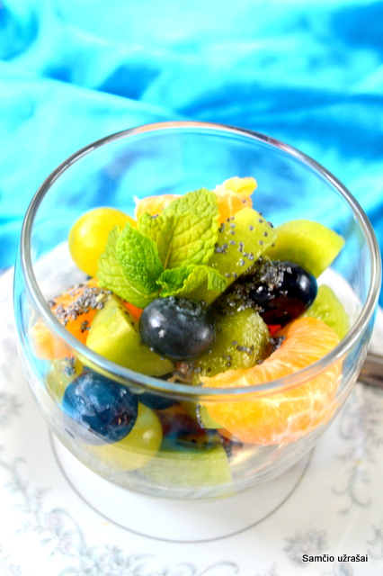 Užpilui sumaišome medų, citrinų sultis ir aguonas. Užpilame ant vaisių.