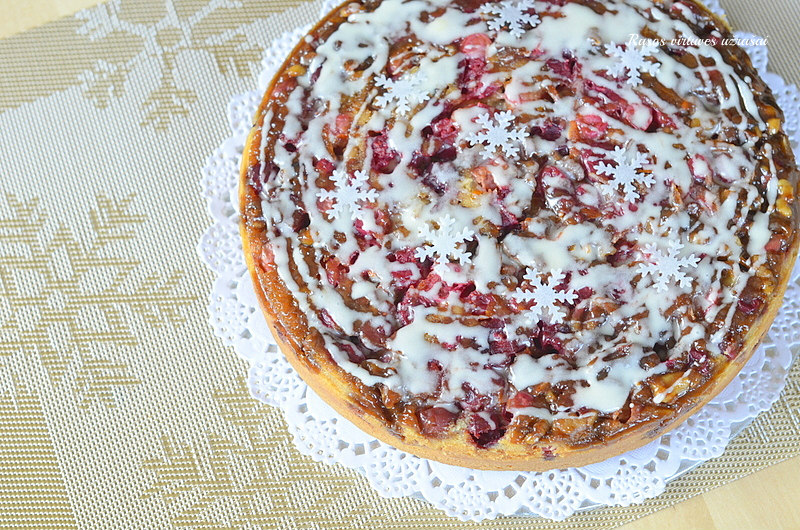 Paruoškite glaistą: miltelinį cukrų, lydytą sviestą ir apelsinų sultis išplakite iki vientisos masės. Masė turi būti neskysta, tačiau ir ne per tiršta. Glaistu apšlakstykite ataušusį pyragą. Skanaus!