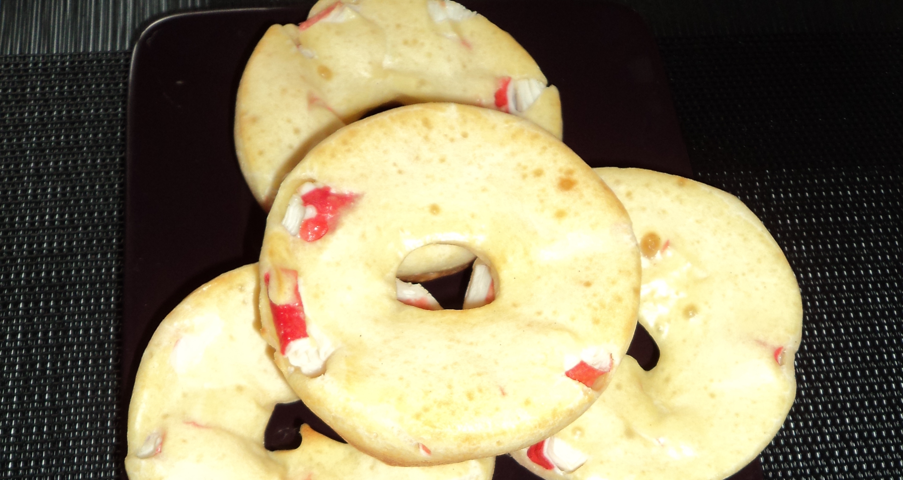 Skardą, skirtą kepti spurgoms (gali būti ir keksiukams skirta skarda), patepame aliejumi. Į formą pilame tešlą, tada dedame sluoksnį krabų lazdelių kubelių ir užpilame tešla.