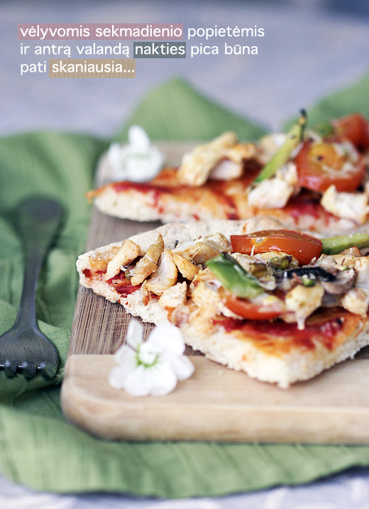 Iš iškilusios tešlos iškočiojame skritulį, dedame jį ant miltais pabarstytos skardos, leidžiame dar pakilti apie 20 minučių. Tada ištepame pomidorų padažu, pabarstome druska ir pipirais. Įkaitintoje orkaitėje kepame picos padą apie 20–25 minutes.
