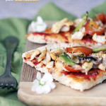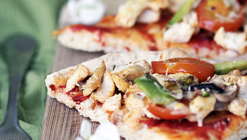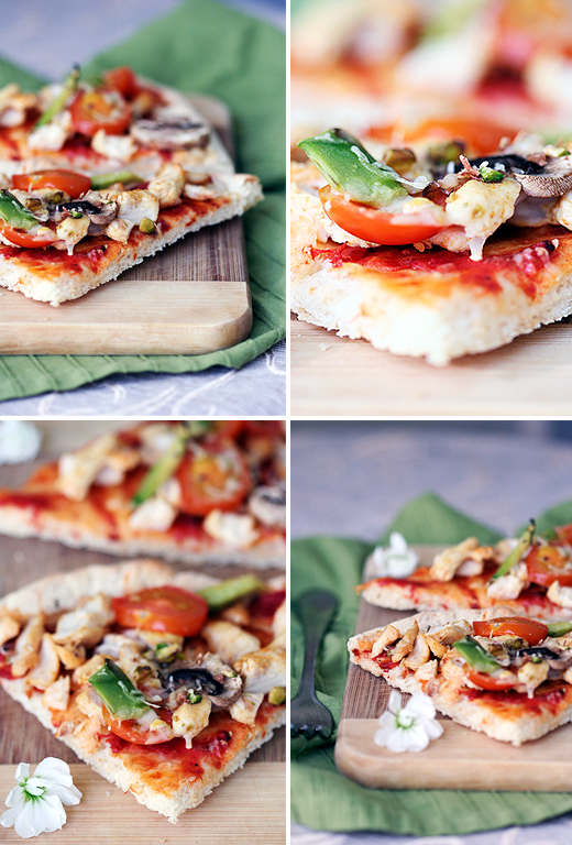 Ant iškepusio, kiek atvėsusio pado sudedame paukštieną, pievagrybius, avokadus, pomidorus, užbarstome riešutų, raudonėlio prieskonių. Ant viršaus užtarkuojame parmezano. Kepame karštoje orkaitėje 10–12 minučių.