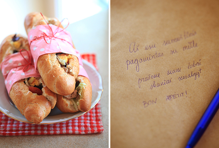 Prapjauname batoną, dalį minkštimo galime išimti. Patepame vidų majonezu ir sudedame kopūsto lapus.