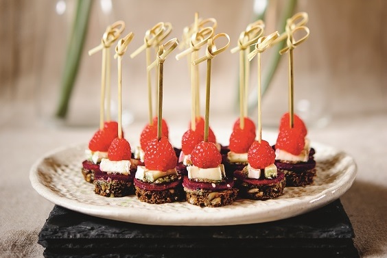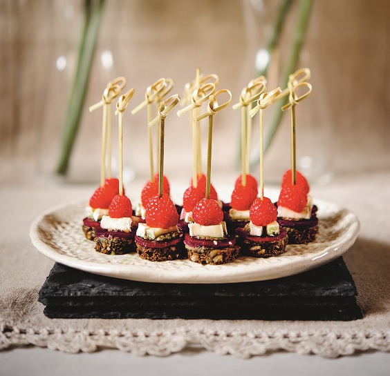 Suformuokite duoniukus: ant duoniukų užtepkite pesto užtepėlės, uždėkite griežinėlį burokėlio, vėl užtepkite užtepėlės, uždėkite sūrio ir prismeikite avietę.