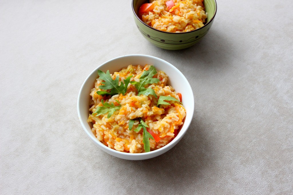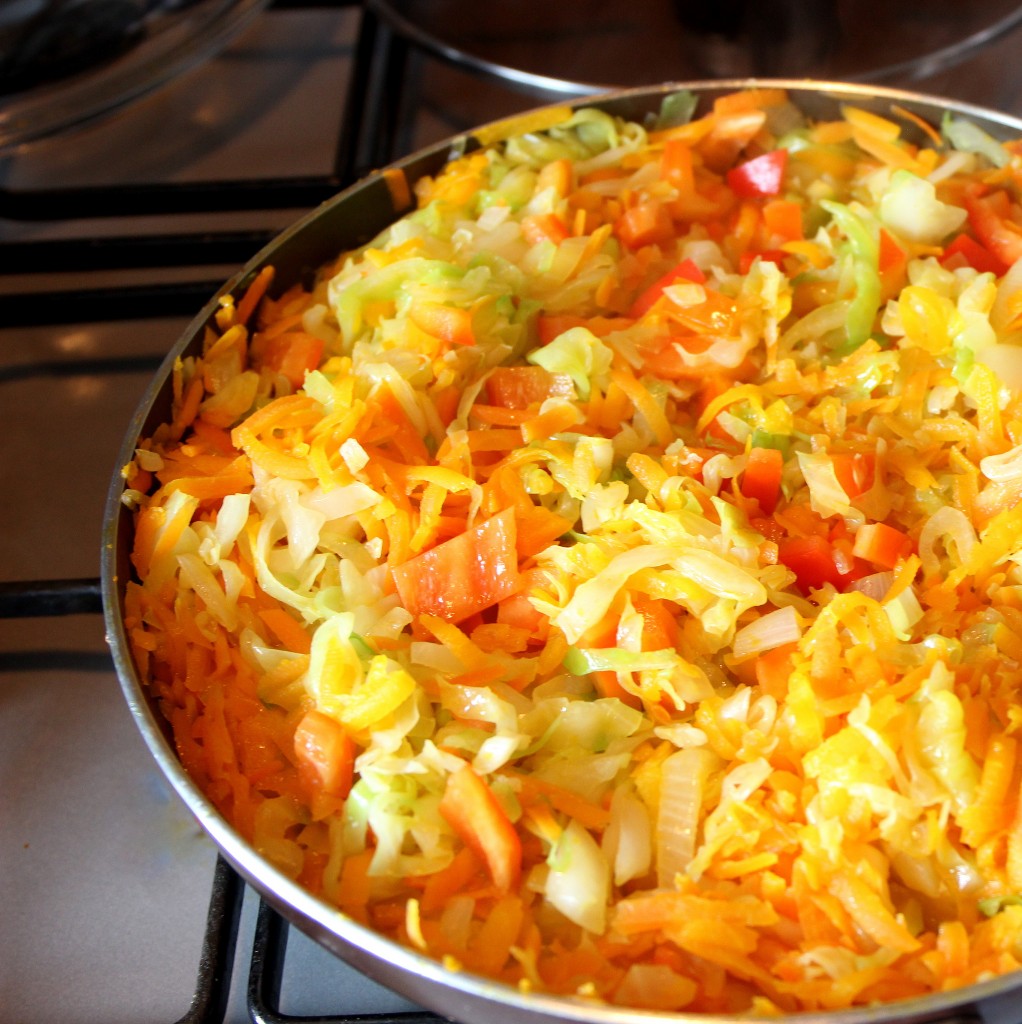 Įpilame pusę puodelio vandens ir leidžiame jam užvirti. Viską išmaišome ir paviriname apie 10 minučių. Morkoms suminkštėjus, dedame supjaustytą kopūstą ir papriką. Užpilame dar trupučiu vandens ir pakaitiname apie 10 minučių vis pamaišydami.