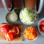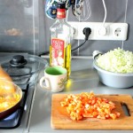 Sutarkuojame arba supjaustome nuluptas morkas, kopūstus. Į mažus kubelius supjaustome papriką.