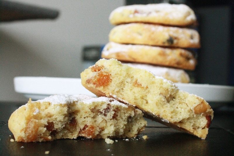 Elektriniu plaktuvu išplakti sviestą ir cukrų iki purios vientisos masės. Supilti vanilės ekstraktą ir vėl gerai išplakti. Suberti miltus, druską ir išmaišyti (nepermaišyti). Įmaišyti džiovintus vaisius. Tešla bus šiek tiek sausa ir trupinių pavidalo, bet suspaudus tarp pirštų turėtų sulipti.