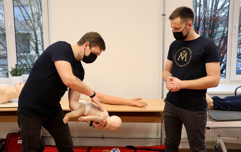 „Pirmiausia reiktų atskirti, žmogus užspringo iš dalies ar visiškai. Esant daliniam užspringimui, žmogus išlieka sąmoningas, kosėja, dar gali kalbėti. Taigi, tokiu atveju reikia tik skatinti jį kosėti ir jokiu būdu netrankyti kosėjančiam per nugarą, nes tai gali jam pakenkti. Visiško užspringimo atveju žmogus jau nebegali kalbėti ir efektyviai kosėti, tuomet jau būtina skubiai suteikti pirmąją pagalbą, nes gyvybiškai svarbi tampa kiekviena sekundė“, – pasakoja Karaliaus Mindaugo profesinio mokymo centro paramedikų profesijos mokytojas ir skubios medicinos gydytojas Karolis Klimavičius. Jis kartu su paramediku ir profesijos mokytoju Tautvydu Bielevičiumi vaizdo pamokoje demonstruoja, kokius pirmosios pagalbos veiksmus reiktų atlikti užspringus kūdikiui, suaugusiajam ir sau pačiam, kai nieko nėra šalia.