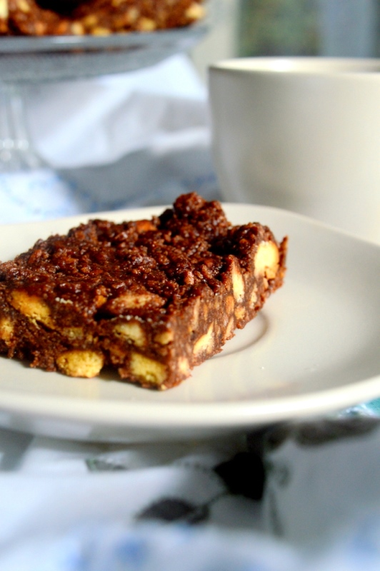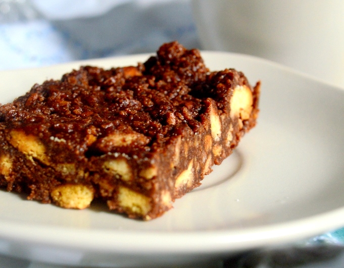 Puode virš garų ištirpinkite smulkintą šokoladą, sviestą ir medų. Maišydami kaitinkite, kol masė taps vientisa. Įmaišykite kakavą. Visą šokoladinę masę užpilkite ant sausainių ir gerai išmaišykite, kad visi sausainiai apliptų ja.