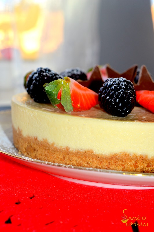 Sūrio ir grietinėlės masę sukrėskite ant sausainių pagrindo, išlyginkite paviršių ir dėkite į šaldytuvą sustingti.