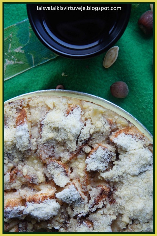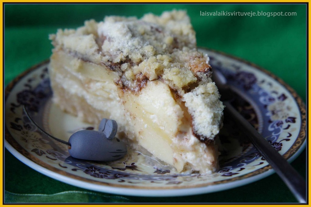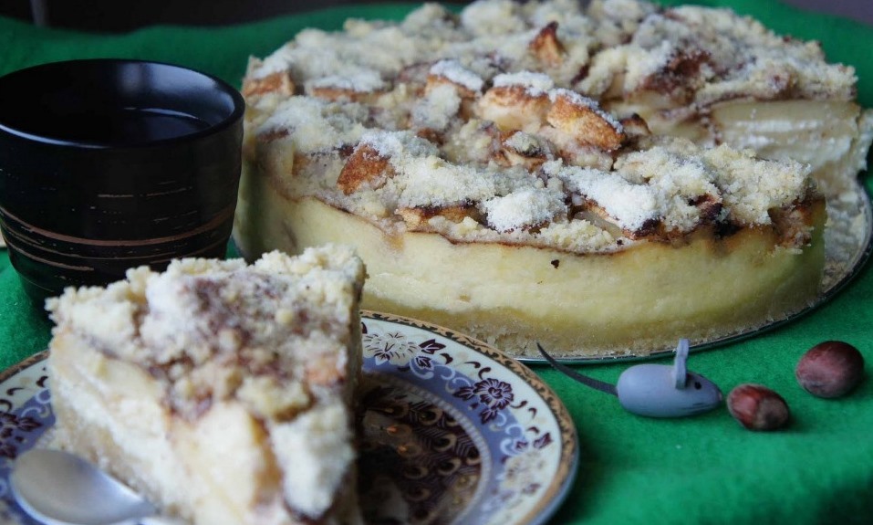 Pasilikti maždaug tris saujas miltų mišinio, o likusį berti į torto formą atsegamais kraštais. Tuomet pilti paruoštą varškės masę, sudėti obuolių riekeles. Apibarstyti cinamonu ir keliais žiupsneliais cukraus. Galiausiai gražiai užbarstyti pasiliktą miltų mišinį ir šauti į iki 180 °C temperatūros įkaitintą orkaitę. Kepti apie 1 val., valgyti ataušusį – tada pyragas skaniausias.