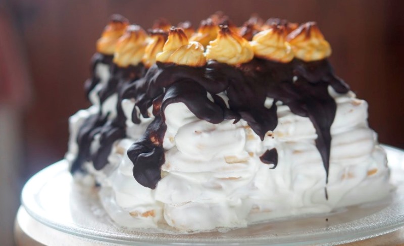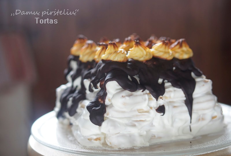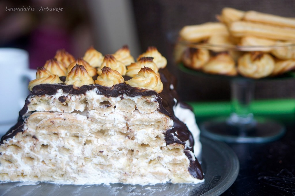 Imkite po vieną plikytos tešlos lazdelę, merkite į paruoštą kremą, dėkite ant pasirinktos tortinės, lėkštės ar padėklo, suformuokite tortą (aš dažniausiai lazdeles kryžiuoju).