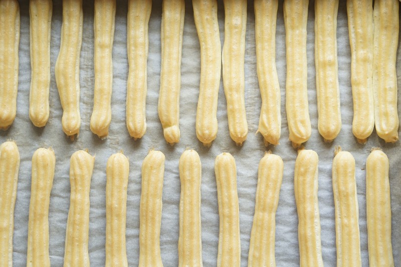 Į atvėsusią masę po vieną muškite kiaušinius, kaskart gerai išplakite. Krėskite visą paruoštą masę į konditerinį maišelį (antgalį pasirinkite apskrita skylute) ir ant paruoštos skardos išspauskite 10–15 cm lazdeles, palikdami 1–2 cm tarpelius. Po vieną skardą šaukite į orkaitę, įkaitintą iki 190 °C temperatūros, vidurinėje eilėje, kepkite ~15 minučių, kol lazdelės išsipūs ir švelniai paruduos, nedarinėdami orkaitės durelių. Lazdelių turėtų išeiti 3 didelės skardos.