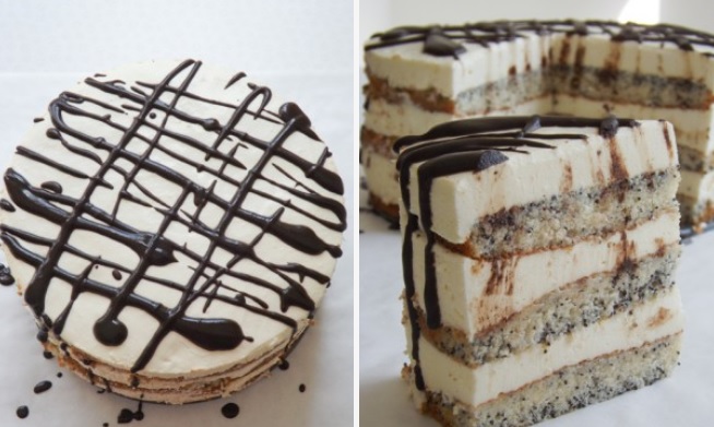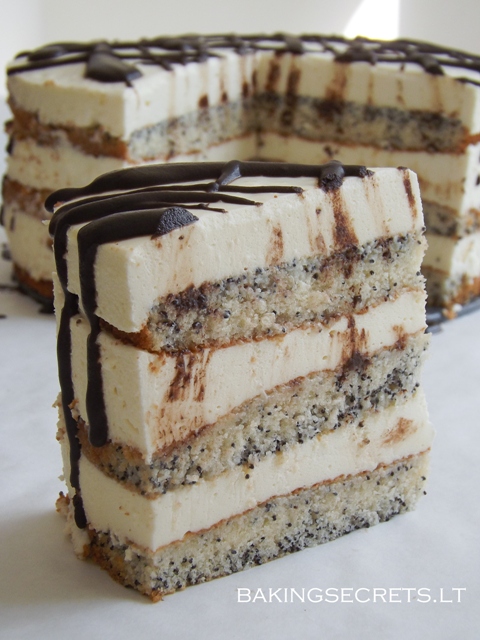 Švelnaus skonio, gaivus, ne per saldus tortas su aguoniniu biskvitu bei grietinėlės ir jogurto kremu.