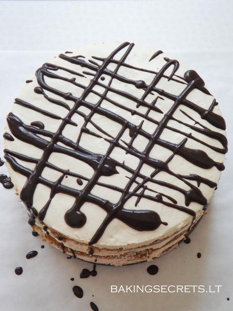 Iš tiesų visas tortas buvo aukštas, vos sutilpo į mano 20 cm skersmens ir 9 cm aukščio formą. Atkreipkit dėmesį į savo formos dydį.