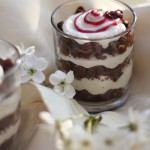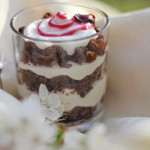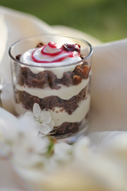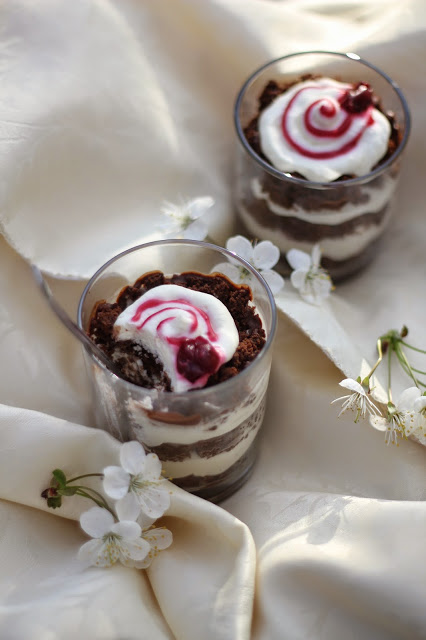 Ataušusį biskvitą sutrupiname į pupos dydžio gabalėlius. Dedame šiek tiek jo į stiklinaites, sulaistome jį vandeniu skiestu vyšnių sirupu (prireiks vos vieno šaukšto sirupo), aptepame šokolado glajumi, išspaudžiame grietinėlę, ant jos dedame vyšnių gabaliukus, tada vėl beriame biskvito, užpilame sirupo, šokoladinio glajaus ir išspaudžiame kremo. Skanaus!