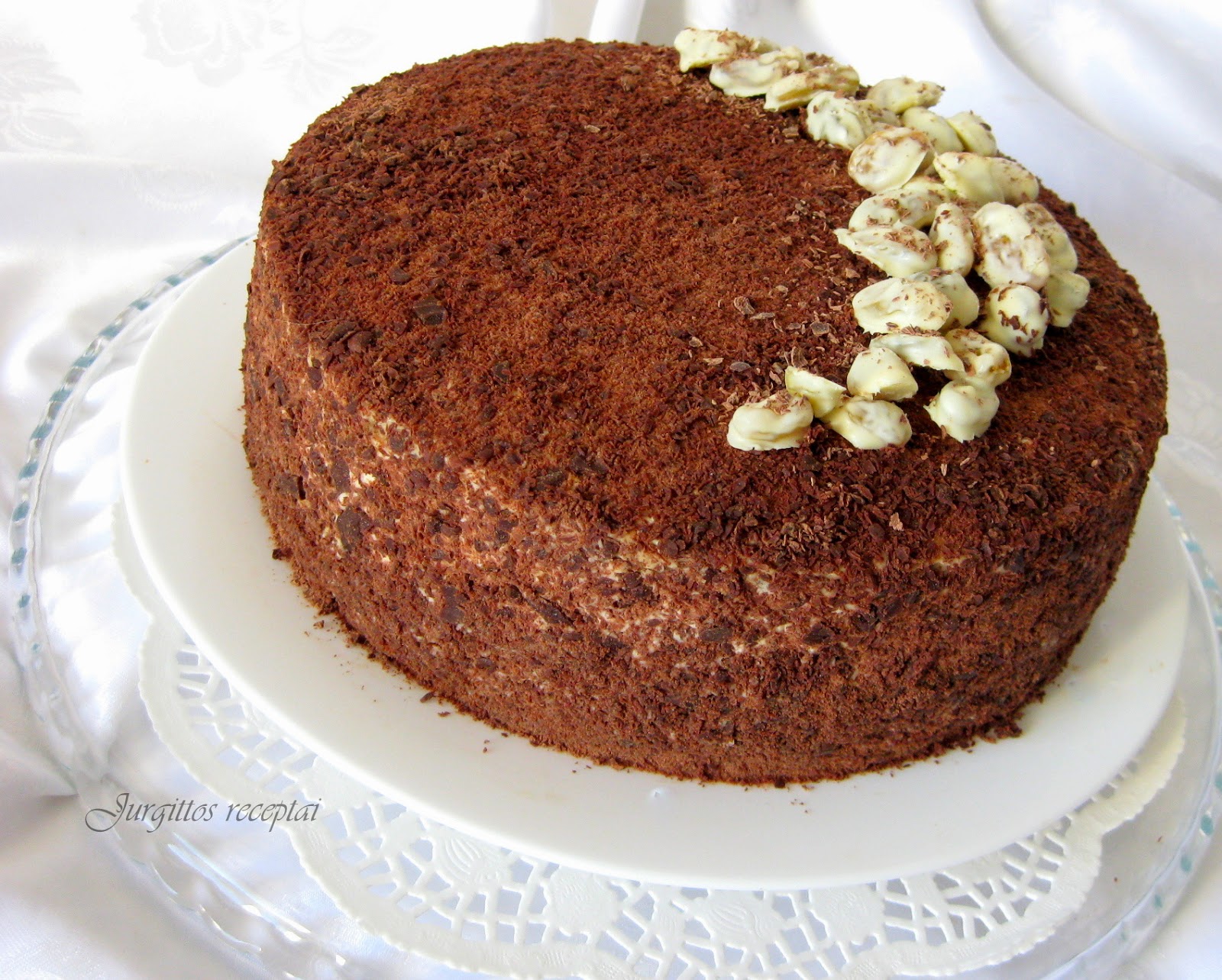 Surinkimas ir puošimas. Sutepame papločius kremu. Viršų ir šonus aptepame tuo pačiu kremu ir barstome tarkuotu šokoladu. Aš viršų puošiau geltonosiomis razinomis su baltuoju šokoladu – labai skanu! (Reikia ištirpinti šokoladą, pamirkyti razinas, dėti jas ant kepimo popieriaus ir sustingdyti šaldytuve.) Tortą laikome šaldytuve per naktį, o dar geriau – parą: jis tampa dar skanesnis. Skanaus!