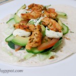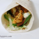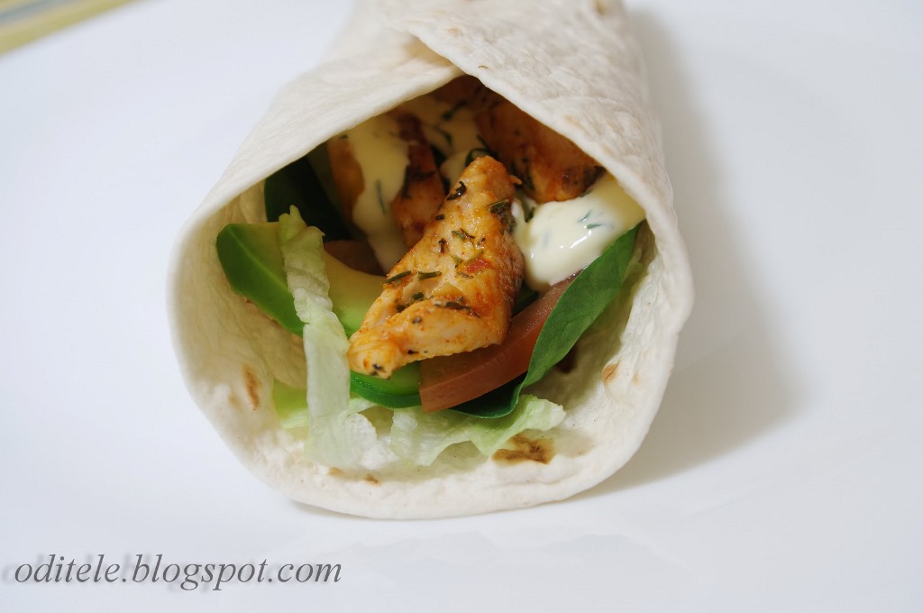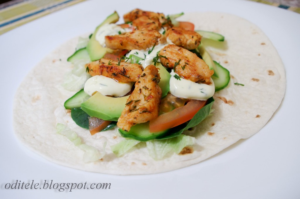 Ant pašildytų tortilijų išdėliokite pjaustytas daržoves, užpilkite padažo ir uždėkite vištieną.