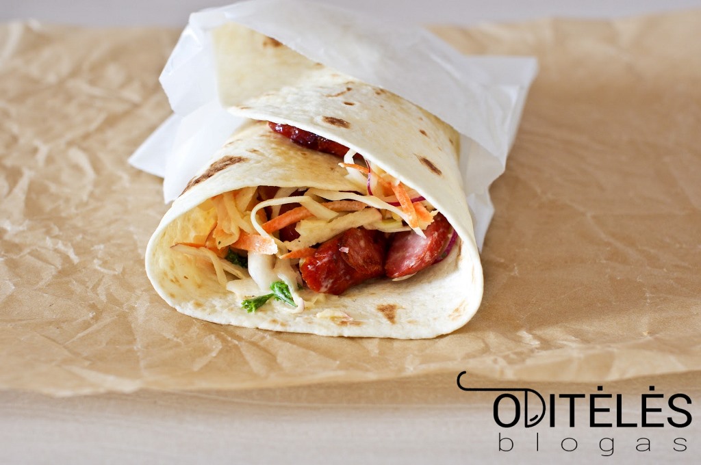 Ant kiekvienos dėkite kopūstų salotų, keptų dešrelių ir susukite.