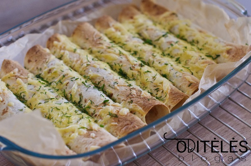 Tortilijas sudėkite į kepimo indą, išklotą kepimo popieriumi, ant viršaus užberkite likusį tarkuotą fermentinį sūrį ir kepkite 220 °C orkaitėje, kol sūris išsilydys ir tortilijos gražiai apskrus.