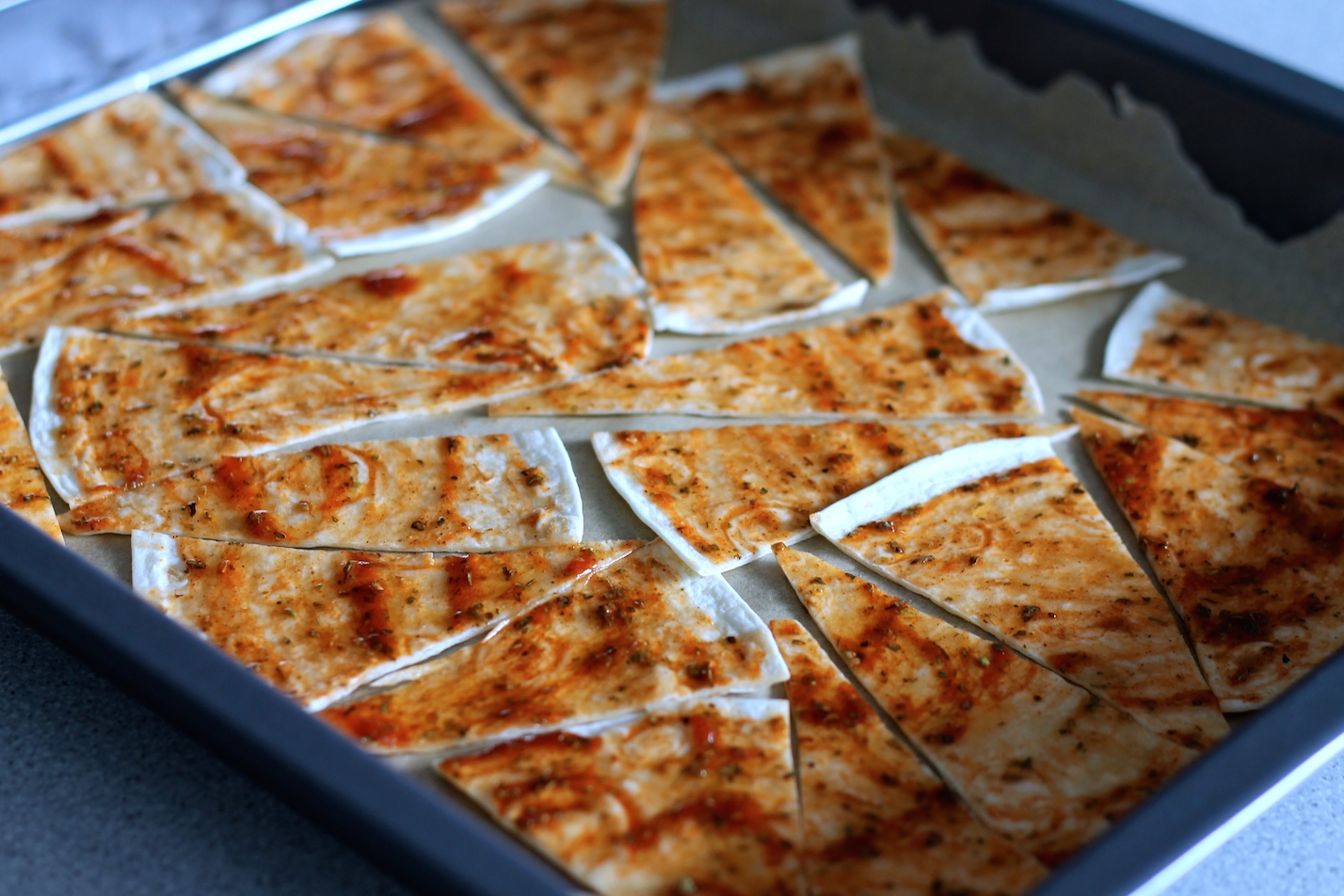 Aliejų sumaišome su pomidorų padažu, druska ir prieskoniais. Mišiniu, naudodami konditerinį teptuką, gausiai ištepame tortilijas. Žirklėmis jas padalijame į daug trikampėlių ir dėliojame juos į kepimo popieriumi išklotą skardą. Pašauname į gerai įkaitintą orkaitę ir kepame apie 5–10 minučių, kol apskrunda. Skanaus!