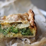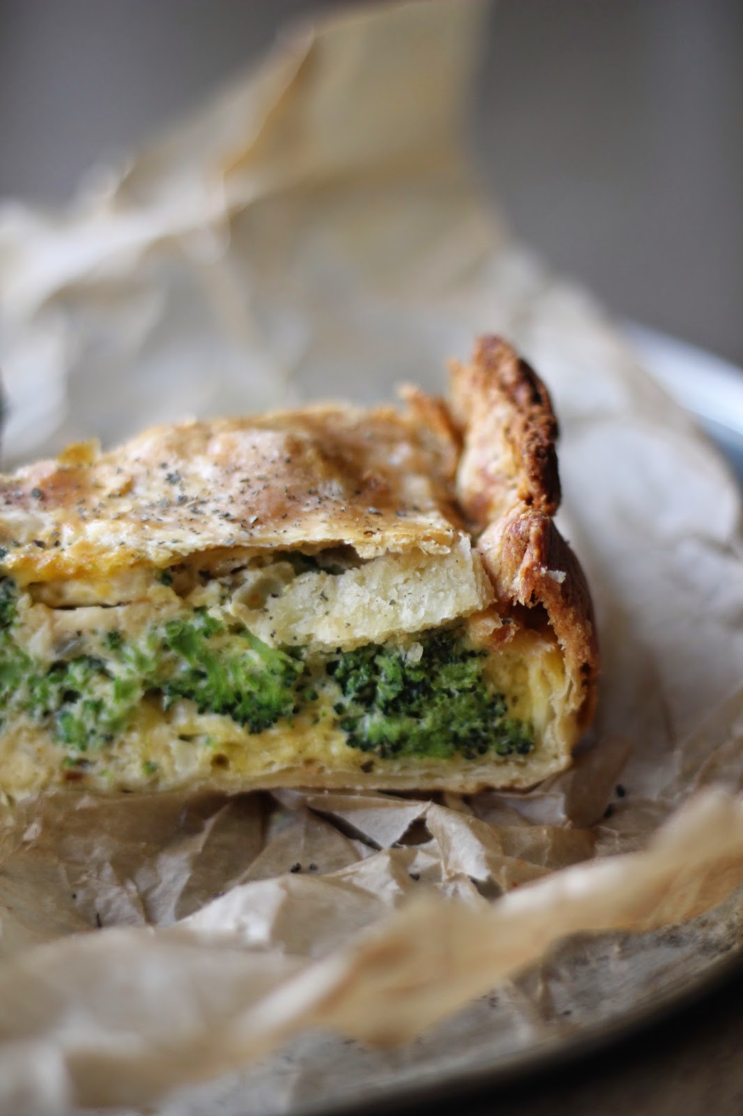 Per tą laiką pasiruošiame įdarą. Kiaušinius lengvai išplakame su pienu, įberiame druskos, pipirų, kalendros, suberiame smulkiai tarkuotą sūrį. Ką darome su brokoliais? Merkiame į karštą vandenį 7−8 min., kad suminkštėtų, perplauname šaltu vandeniu, išskaidome žiedynais ir suberiame į kiaušinių plakinį.