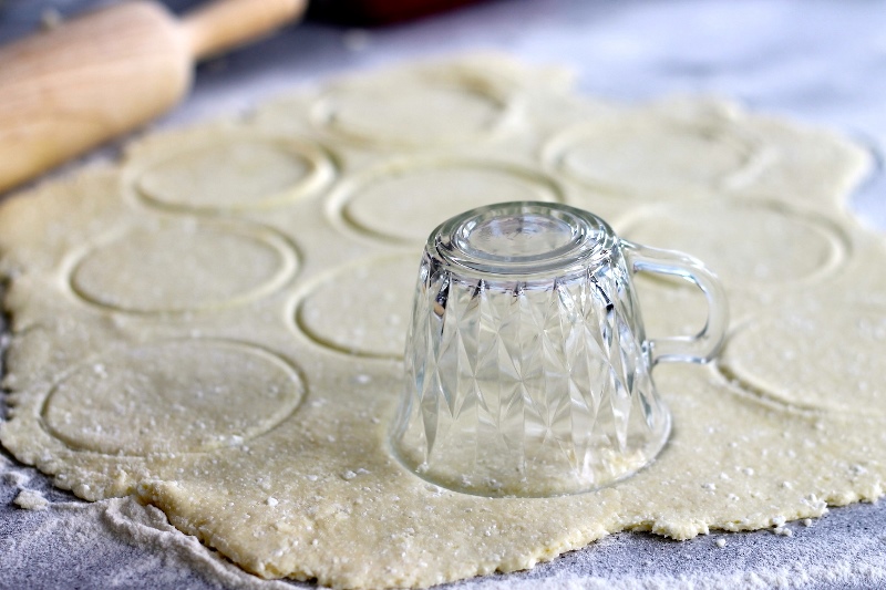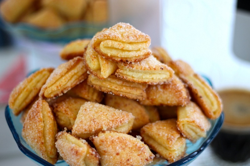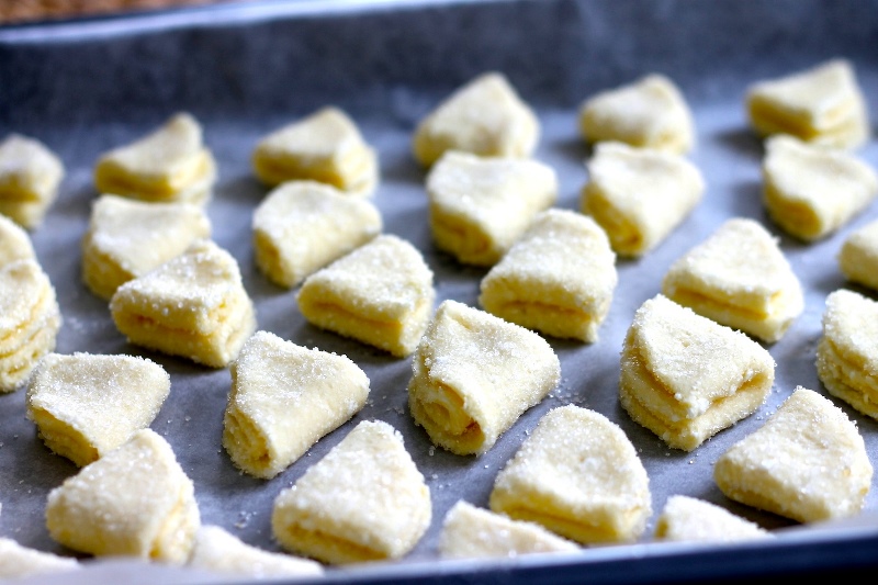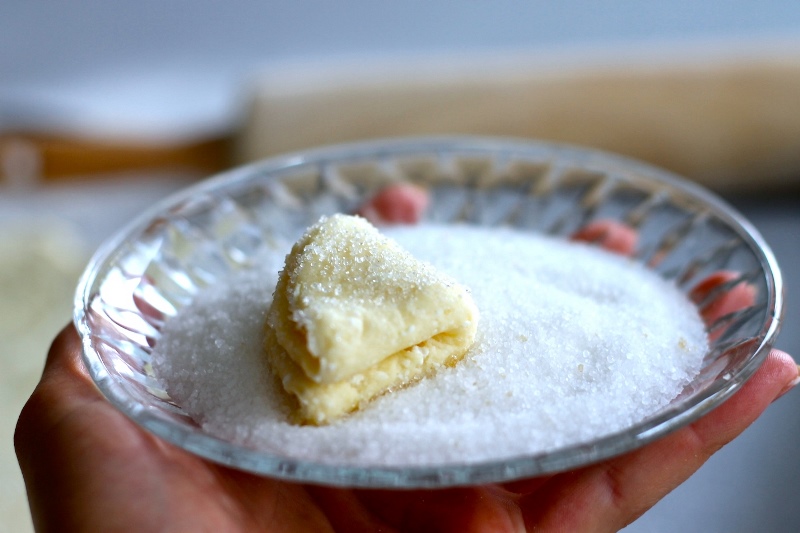 Ant pamiltuoto stalviršio kočiojame kuo plonesnę tešlą ir stikline spaudžiame skrituliukus. Abi skrituliuko puses prispaudžiame prie cukraus, kad priliptų, ir du kartus perlenkiame pusiau. Kiekvieną sausainėlį dedame į skardą, išklotą kepimo popieriumi. Kepame orkaitėje, įkaitintoje iki 190 °C, kol gražiai tolygiai paruduos.