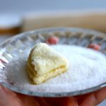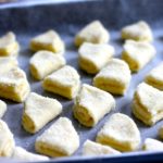 Varškę ištriname su kambario temperatūros sviestu, suberiame vanilinį cukrų, miltus ir suminkome vientisą tešlos rutulį.