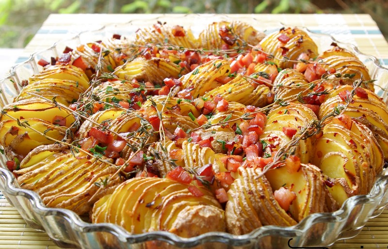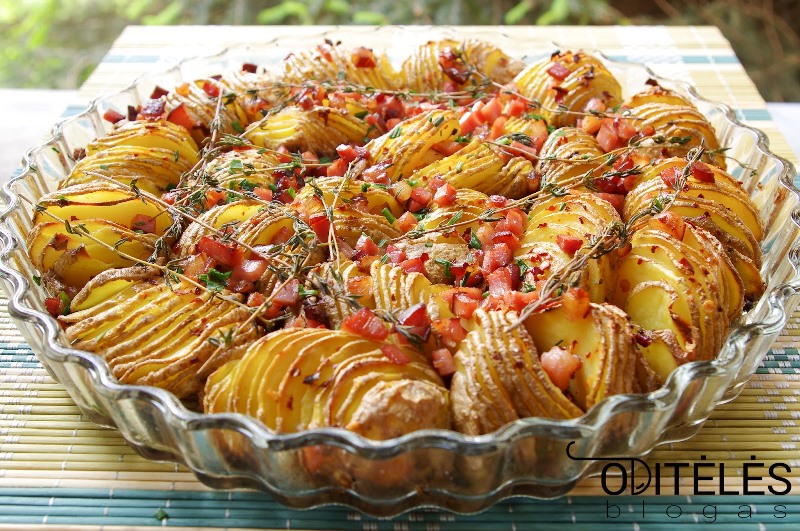 Bulves kruopščiai nuplaukite ir palikite su lupena arba nuskuskite. Jų kiekis priklausys nuo formos dydžio. Todėl pirmiausia į švarią formą sudėkite bulves ir taip sužinosite jų kiekį (naudota 28 cm skersmens forma, tilpo apie 26 bulves).