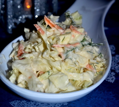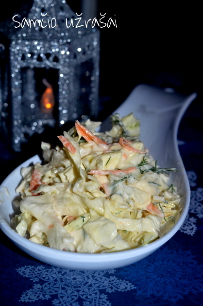 Majonezą išmaišykite su citrinos žievele ir smulkintais krapais. Užpilkite ant smulkintų kopūstų ir gerai išmaišę dėkite į šaldytuvą porai valandų.