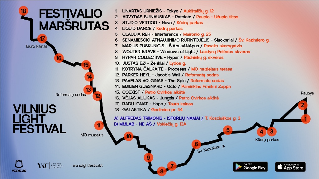 Įveikti daugiasluoksnį festivalio maršrutą, lengviau rasti ir aplankyti visus objektus ir šiais metais padės atnaujinta mobilioji programėlė, kurią atsisiųsti arba atsinaujinti galima „App Store“ (http://bit.ly/vilniuslightfestival) arba „Google Play“ (http://bit.ly/vilniuslightfestival1).