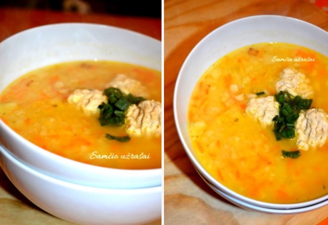 Svogūnus ir morką nulupkite, susmulkinkite. Keptuvėje įkaitinkite aliejų ir apkepinkite svogūnus su morkomis. Sudėkite daržoves į sultinį ir dar virkite 10 min. Sutrinkite sriubą iki vientisos masės (aš lengvai patryniau, nes nenorėjau visiškai sutrintos). Sudėkite kukuliukus, jeigu trūksta, įberkite prieskonių ir uždengę puodą palaikykite 5–10 min.