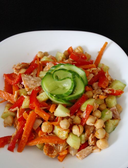 Sudedame morkas, tuną, avinžirnius, papriką ir kalendrą, viską išmaišome. Užpilame padažą, pamaišome, kad padažas pasiskirstytų. Ir viskas! Skanaus.