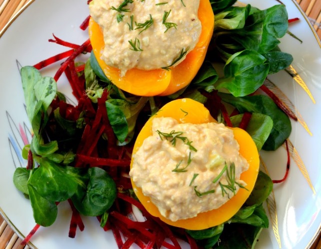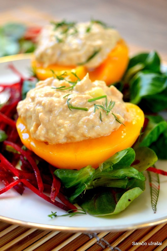 Į lėkštę dedame salotų mišinio. Sudedame persikų puseles ir šaukštu į persikų puseles dedame tuno masę. Apiberiame smulkintais krapais.